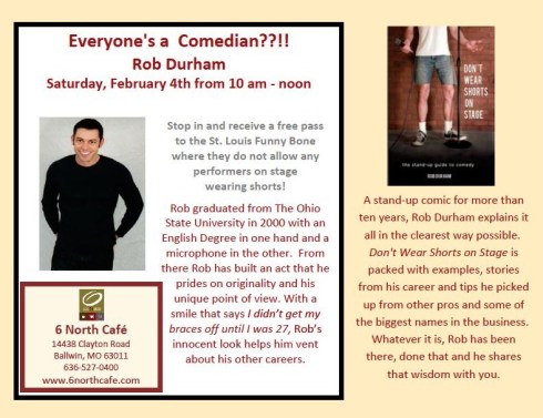 To read and learn about these things simply click the link on this page or visit www.robdurhamcomedy.com to order a copy of my book to figure out how you can take the next step towards making money to perform. Or if you need to wait until that next paycheck I’ll be doing some local book signings around St. Louis. The next one is Febraury 4th and each purchase will get you two tickets to the St. Louis Funnybone…